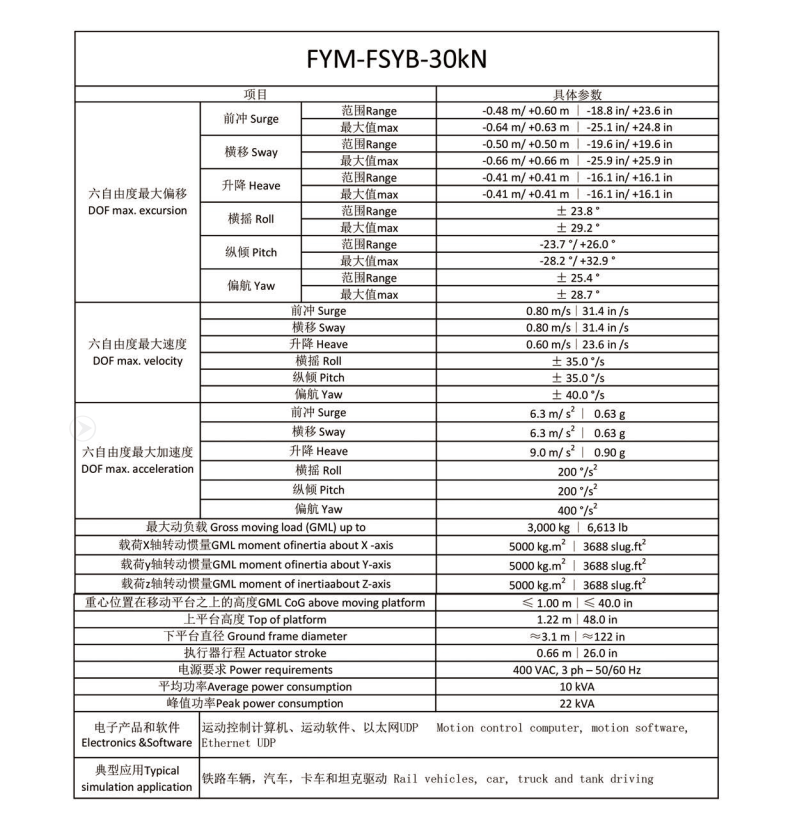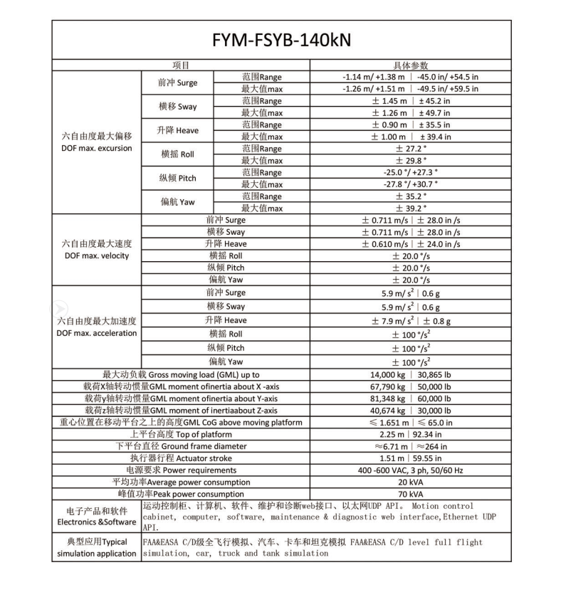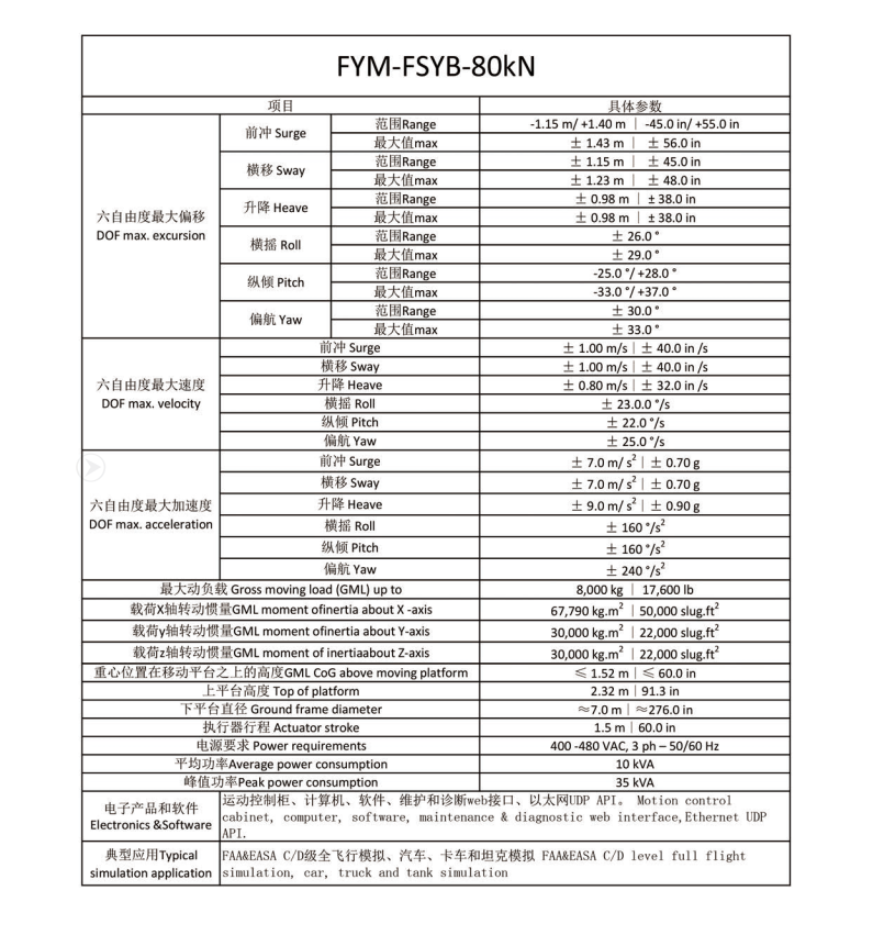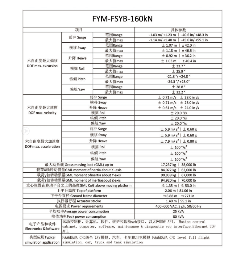 我公司六自由度運動平臺的各個型號,覆蓋了從 1,000 公斤到 16,000 公斤的載荷范圍(2,200 到 38,000 磅),滿足各行業客戶仿真模擬不同領域的運動,詳情如下: